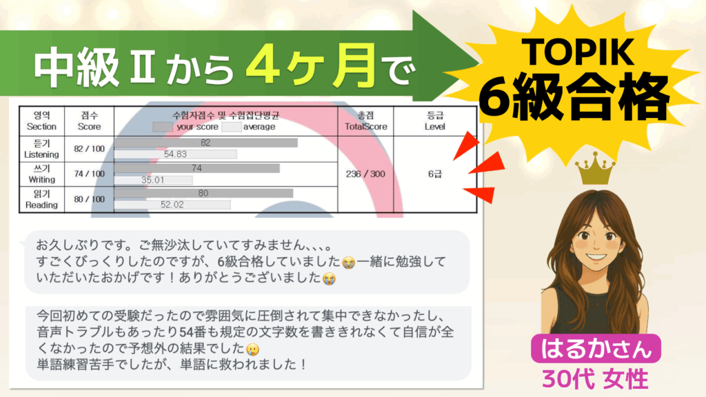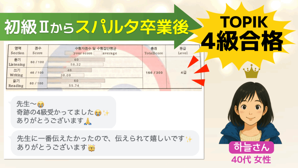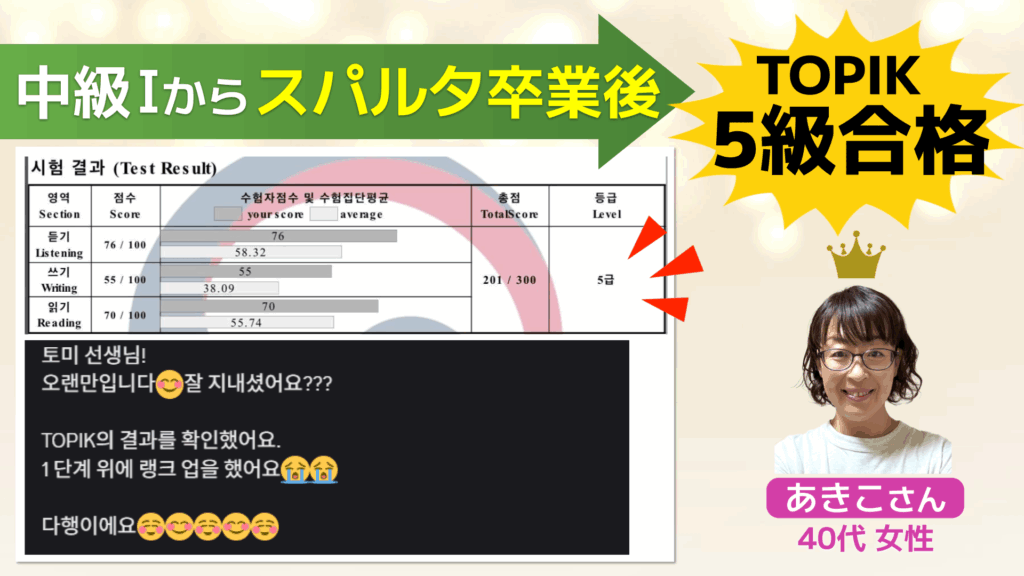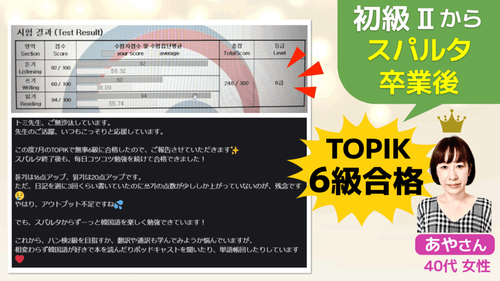 40代女性が スパルタ2ヶ月を経て 前回より31点upで TOPIK6級合格!