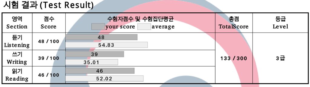 それが、今回4月13日の本番のTOPIKの試験で、듣기 48点、쓰기39点、읽기 46点と合計133点を取り、TOPIK3級に堂々と合格されています!