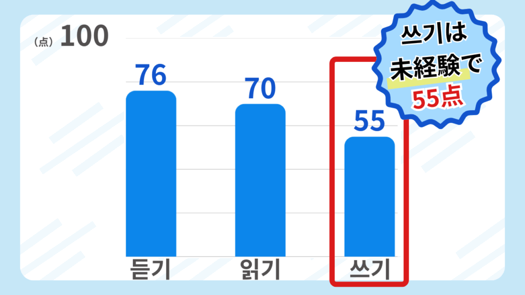 쓰기に関していえば、未経験からスタートし、平均37点の試験で55点を叩き出しています!!