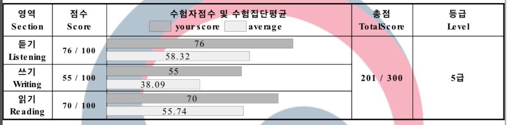 実績の方の結論から言うと、あきこさんは、7月13日の本番のTOPIKの試験で、듣기 76点、쓰기 55点、읽기 70点と合計 201点を取り、TOPIK5級に堂々と合格されています!