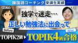 私と同世代の方々が受講を通じて実力を伸ばし、TOPIK合格を勝ち取っていく姿に心を打たれ、「私もこの先生から学びたい」と強く思いました。