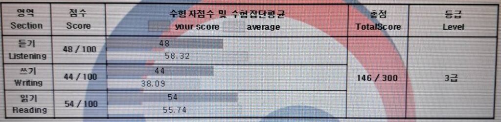 それが、今回7月13日の本番のTOPIKⅡの試験で、듣기 48点、쓰기44点、읽기 54点と合計146点を取り、TOPIK3級に堂々と合格されています!