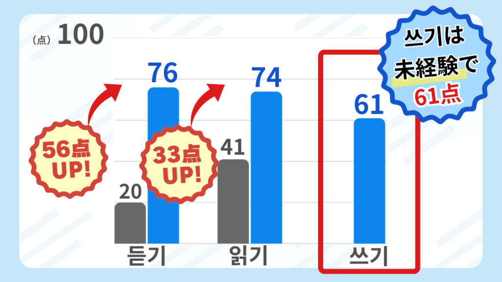쓰기に関していえば、未経験からスタートし、平均37点の試験で 61点を叩き出しています!!