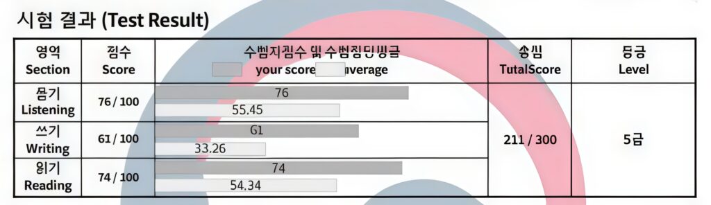 それが、今回 10月19日の本番のTOPIKの試験で、듣기 76点、쓰기 61点、읽기 74点と合計 211点を取り、TOPIK 5級に堂々と合格されています!
