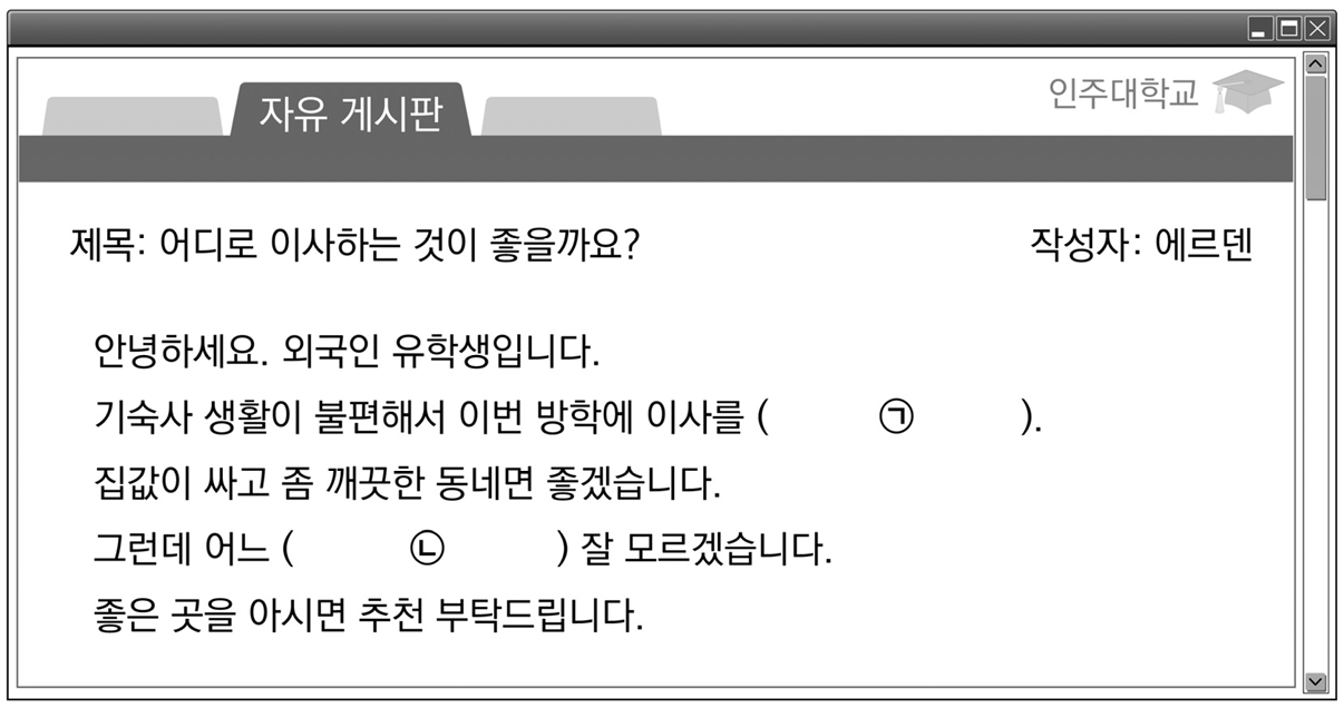 (㉡)は그런데 어느(㉡) 잘 모르겠습니다「しかし、どんな( ㉡ )よくわかりません」とあり、어느「どんな」の後ろには名詞がくるため、当てはまる名詞をまず探します。前の文の집값이 싸고 좀 깨끗한 동네면 좋겠습니다「家賃が安く、ちょっと綺麗な町だと嬉しいです。」から、「綺麗な町」の「町」が「どんな」に繋がる名詞だと分かります。しかし、どんなところが良いかを決めていないことから、疑問の形にする必要があります。韓国語では間接疑問文で「~か」という場合、~지/~을지を使います。したがって、동네가 좋은지 / 동네가 좋을지 / 곳으로 갈지 のいずれも適切な回答となります。