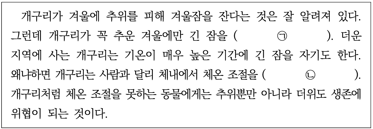 (㉠)は、개구리가 꼭 추운 겨울에만 긴 잠을 (㉠)「蛙が必ず寒い冬だけ長い眠りを( ㉠ )」から、잠을「眠りを」に適切に繋がる動詞を探します。すぐ後ろの文章で、더운 지역에 사는 개구리는 기온이 매우 높은 기간에 긴 잠을 자기도 한다「暑い地域に住む蛙は、気温が非常に高い期間に長い眠りについたりもする」とあり、잠을 자다「眠りにつく」が入ることが分かります。続いて、蛙が寒い冬だけに長い眠りをするわけではないという意味にする必要があります。韓国語で「~するわけではない」という表現は連体形の後に -것은 아니다「~ではない」の文型になります。자는 것「寝ること」に-는 것은 아니다「~ではない」を組み合わせて、자는 것은 아니다とするのが適切です。