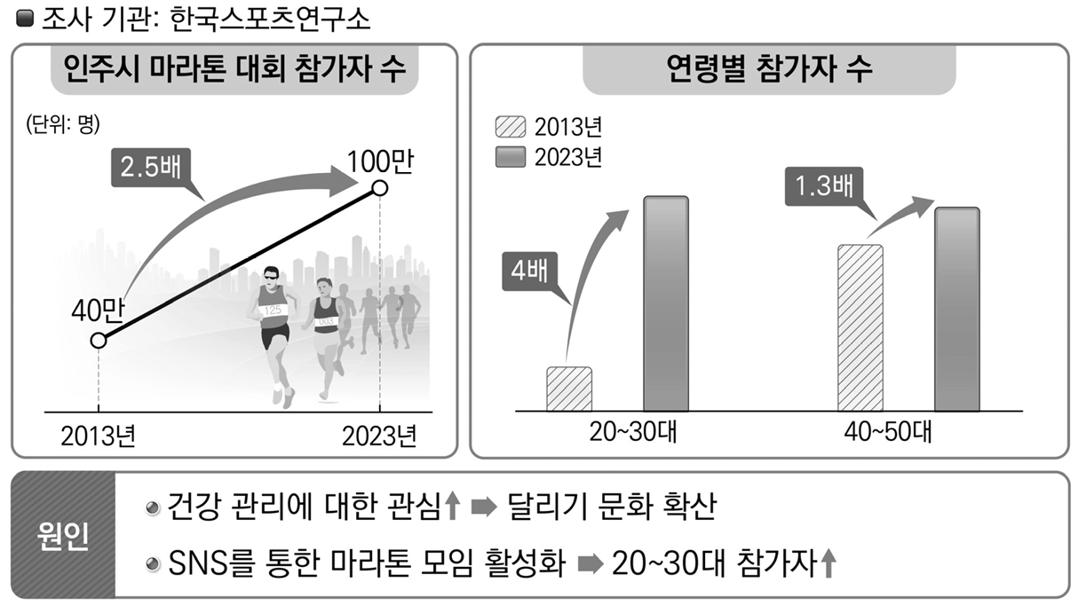 한국스포츠연구소에서 인주시 마라톤 대회 참가자 수의 변화를 조사하였다. 그 결과 인주시 마라톤 대회 참가자 수는 2013년 40만 명에서 2023년 100만 명으로 2.5배 증가한 것으로 나타났다. 이를 연령별로 살펴보면 20~30대는 지난 10년간 4배 증가한 반면 40~50대는 같은 기간에 1.3배 증가하는 데에 그쳤다. 이러한 변화의 원인은 건강 관리에 대한 관심이 높아져 달리기 문화가 확산되었고 SNS를 통한 마라톤 모임이 활성화되어 20~30대 참가자가 증가하였기 때문인 것으로 보인다.