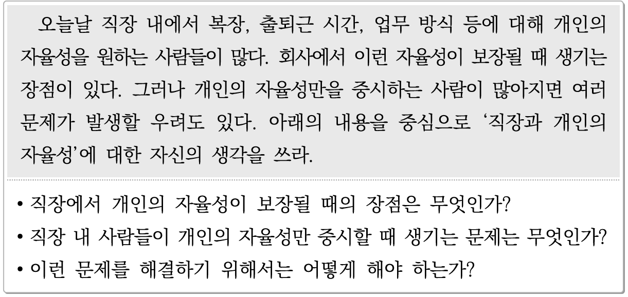 오늘날 직장 내에서 복장, 출퇴근 시간, 업무 방식 등에 대해 개인의 자율성을 원하는 사람들이 많다. 회사에서 이런 자율성이 보장될 때 생기는 장점이 있다. 그러나 개인의 자율성만을 중시하는 사람이 많아지면 여러 문제가 발생할 우려도 있다. 아래의 내용을 중심으로 ‘직장과 개인의 자율성’에 대한 자신의 생각을 쓰라.